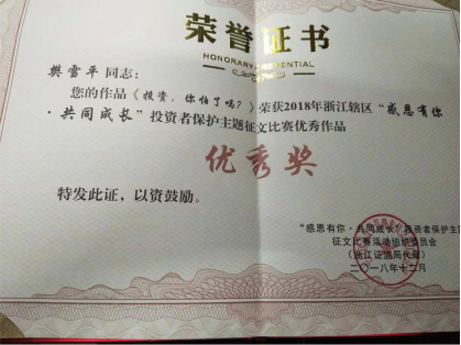 2017级非诉实验班学生樊雪平提交的作品《投资,你怕了吗?》在此次活动中荣获2018年浙江辖区比赛优秀作品“优秀奖”。该作品以改革开放40周年为背景主线,以见证者的角度,用真实事例和具体数据展示改革开放以来资本市场的改革成就;以建言者的角度,为加强投资者保护,促进资本市场持续健康发展建言建策,展望了对新时代中国特色资本市场的美好愿望,凝聚了同心共筑资本市场中国梦的磅礴力量。