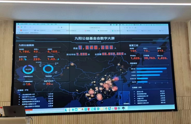 在“天宫”会议室,九阳公益基金会的黄晖副秘书长向我们介绍了九阳公益历程和九阳公益基金会下两大核心项目,九阳公益厨房与九阳食育工坊。九阳公益厨房聚焦了贫困地区农村中小学资金不足环境差、建不起食堂,中小学生进不起饭堂、饥饿营养不良的吃饭问题。从项目建设初期到现在的十余年间,九阳公益厨房团队通过对口援建的模式,投入6168万元,凝聚社会力量推动标准化样板厨房建设,使1196所学校、43万就餐人从中受益。