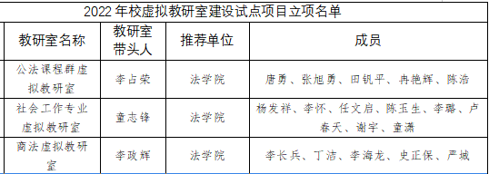 经学院推荐,校专家组评审,学校确定立项2022年校级虚拟教研室建设试点项目12个。色色动画 “公法课程群虚拟教研室”、“商法虚拟教研室”、“社会工作专业虚拟教研室”获立项。