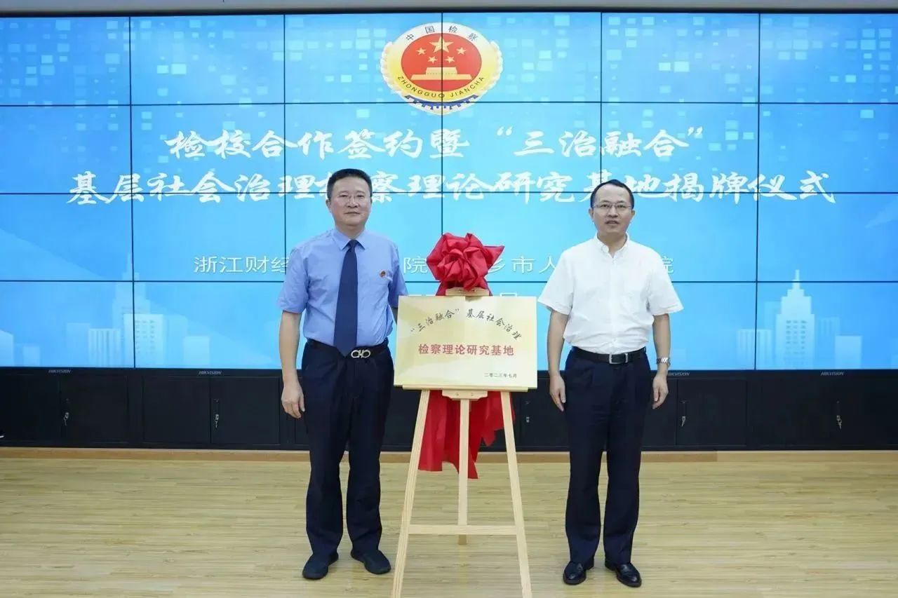院长童志锋与陈国根检察长为“三治融合”基层社会治理检察理论研究基地揭牌。双方将进一步拓宽合作共建空间,持续深化合作关系,有效发挥实践总结理论、理论指导实践的积极作用,实现共建共赢。