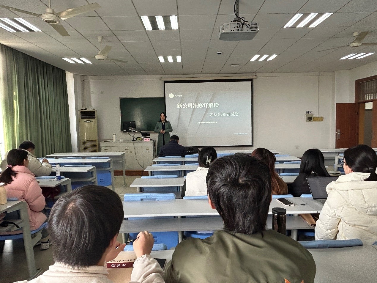 校友、浙江六和律师事务所鲍贝贝律师做客“鹅湖讲坛”,为法学非诉班的同学们带来了一场以“新公司法修订解读——从出资到减资”为主题的讲座,并和同学们分享了自己作为执业以来的经验。讲座由22级法学非诉班主任郝艳兵副教授主持。