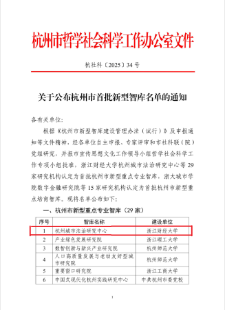 组织申报的“杭州城市法治研究中心”(首席专家:李占荣,负责人:唐勇,智库秘书:朱晶晶)被认定为首批杭州市新型重点专业智库,自2025年12月5日起给予资助,建设期5年。