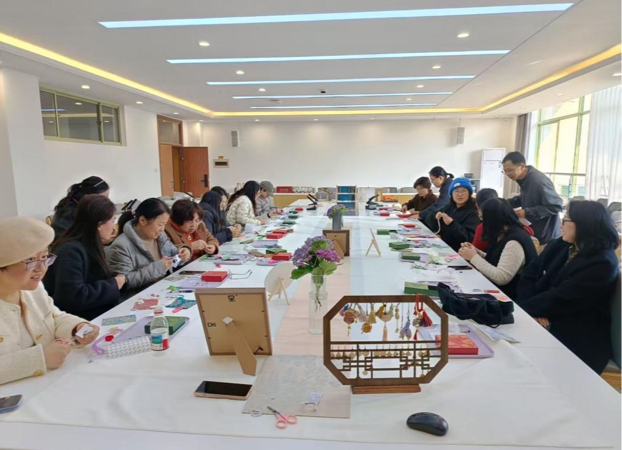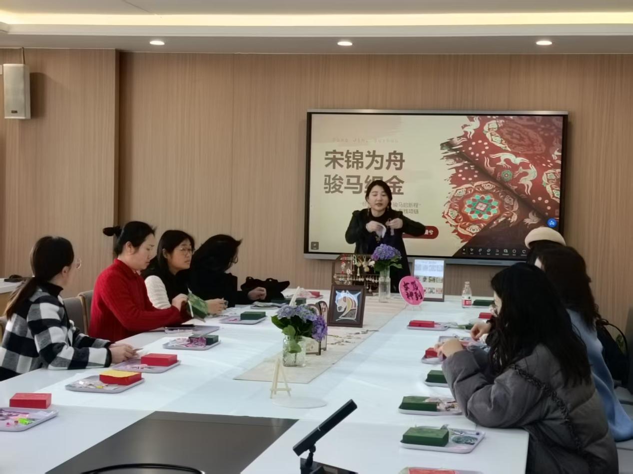 工会在301会议室精心组织了一场以“慢琢时光,锦上添花”为主题的宋锦项链、挂饰手工制作活动。二十多位女教师欢聚一堂,在经纬交织的非遗技艺中,共同度过了一段优雅而治愈的午后时光。
