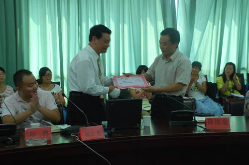 学院党总支书记蔡国金为福山龙教授颁发了客座教授聘用证书,并为其佩戴我校校徽。法律