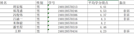 依照学生报名情况,按照男生组1:3比例和女生组1:3比例组织学生面试,即按入学来所有课程平均学分绩点排序,各选择报名学生的前12名进入面试(男生组9人报名,2人不符合报名条件,故剩下7人全部进入面试)。面试顺序按学号升序排序(具体见截图)