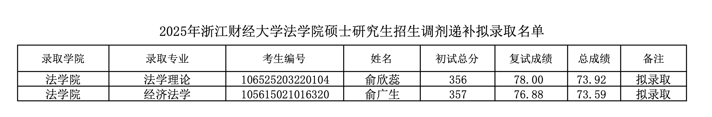 因学校招生计划调整,法学理论、经济法学硕士研究生新增2个招生名额,现将递补拟录取名单公示如下,现予以公示(公示期7天)。如有异议,请联系色色动画 研究生办公室,联系电话:0571-87557364,联系人:封老师。