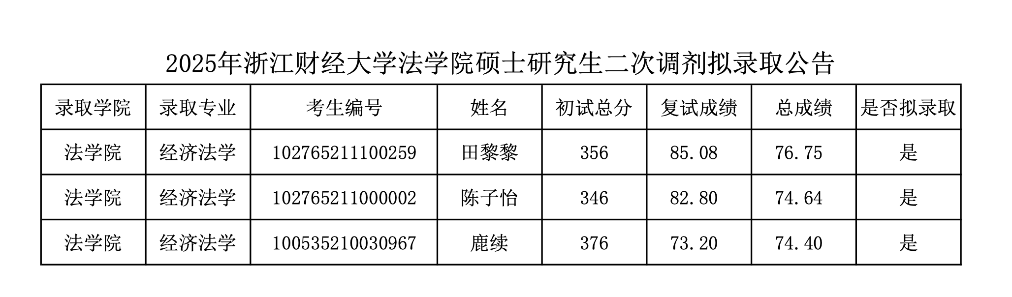 因学校招生计划调整,经济法学硕士研究生新增3个招生名额,经色色动画 硕士研究生复试专家小组复试,现将二次调剂拟录取名单公示如下,现予以公示(公示期7天)。如有异议,请联系色色动画 研究生办公室,联系电话:0571-87557364,联系人:封老师。