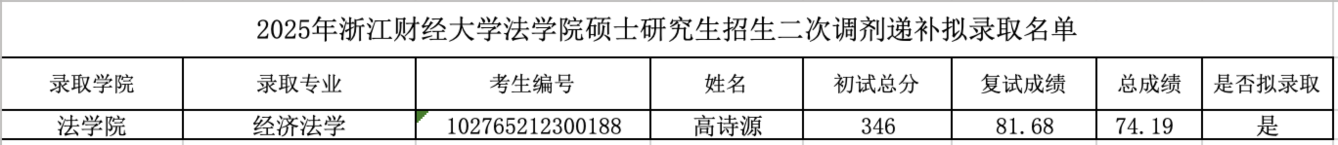因学校招生计划调整,经济法学硕士研究生新增1个招生名额,现将递补拟录取名单公示如下,现予以公示(公示期7天)。如有异议,请联系色色动画 研究生办公室,联系电话:0571-87557364,联系人:封老师。