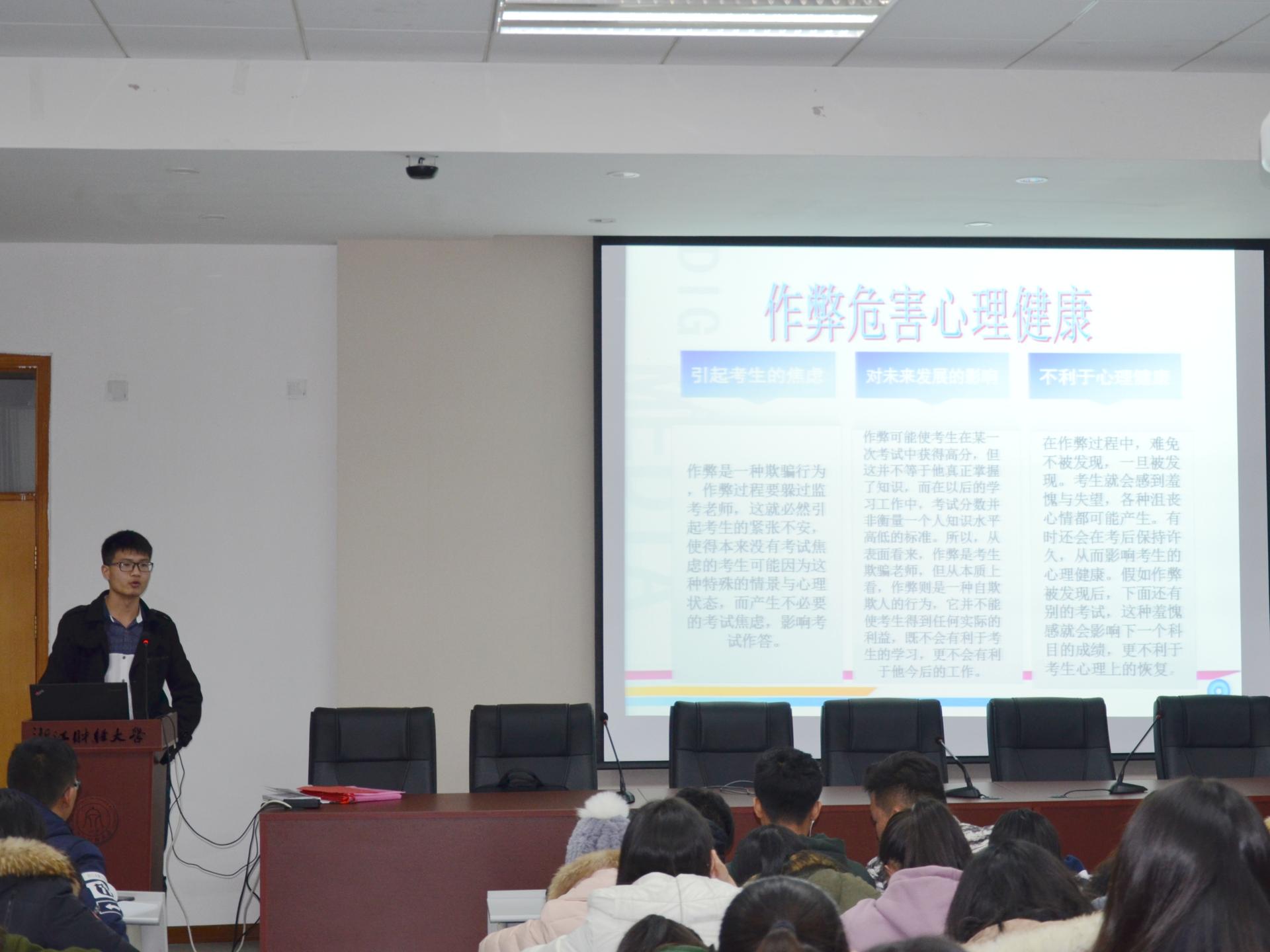 之后,各带班辅导员老师分别到所带班级宣讲考试纪律,从《学生手册》中的相关考场规则与违纪处理方法讲起,严肃说明违反考纪的后果,并列举了考试作弊相关案例,要求同学们遵守学校考试纪律、诚信考试,杜绝作弊行为,做一个诚实守信的人。