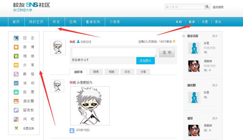 3、账号登陆后,如下图所示,对于个人而言,校友可以发日志、微博、上传相册、建立群组,发起活动等功能;校友还可以邀请其他校友至该社区,共同交流。同时,还有校友版块,可以更改自己的信息,查询自己的同班校友信息,加强校友与校友之间的联系和感情。