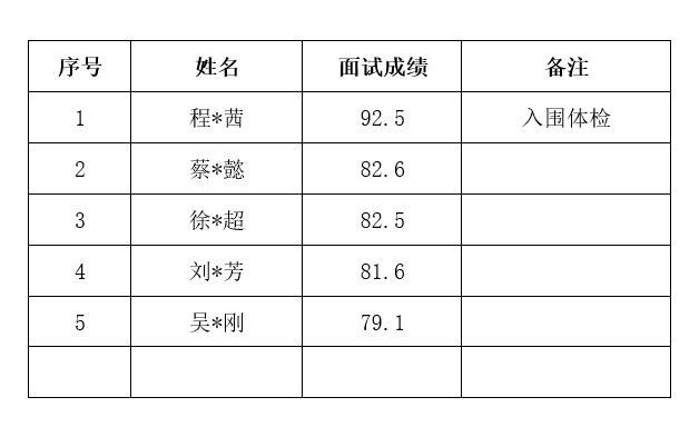 根据《色色动画 招聘社会服务岗位(劳务派遣制)工作人员公告》要求,经报名、资格审核、面试,现将2024年8月15日组织的社会服务岗位(劳务派遣制)招聘的面试成绩及入围体检人员名单予以公示: