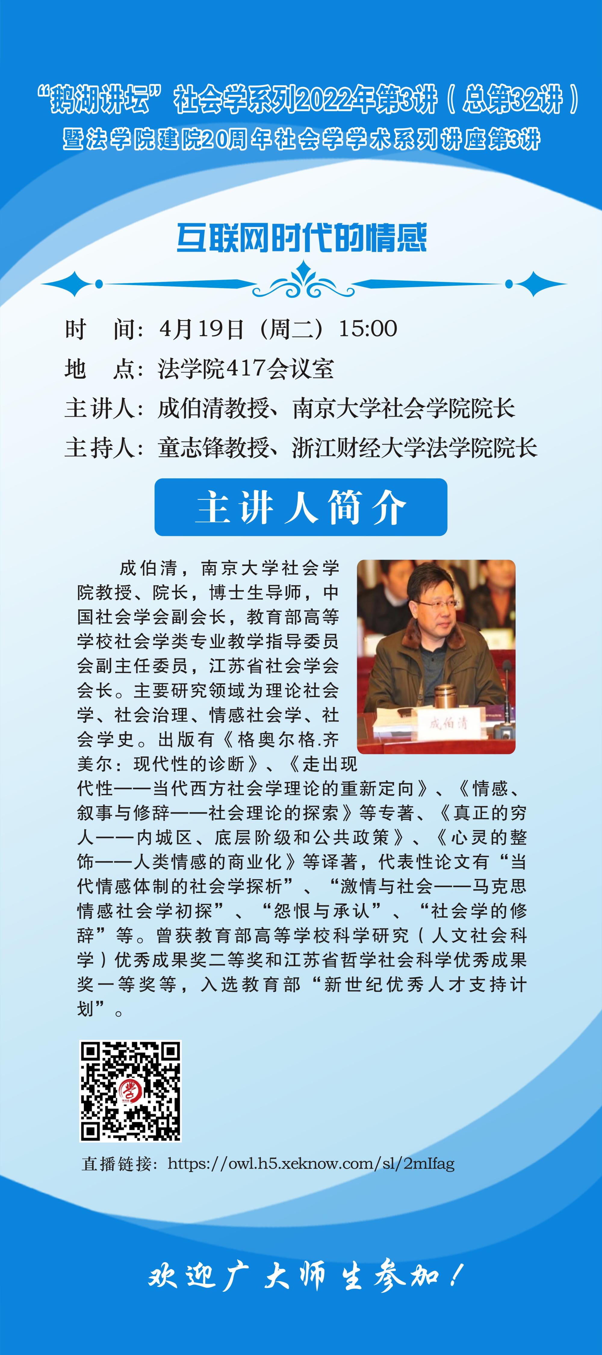 “鹅湖讲坛”社会学系列2022年第3讲暨色色动画 建院20周年社会学学术系列讲座第3讲南京大学成伯清教授