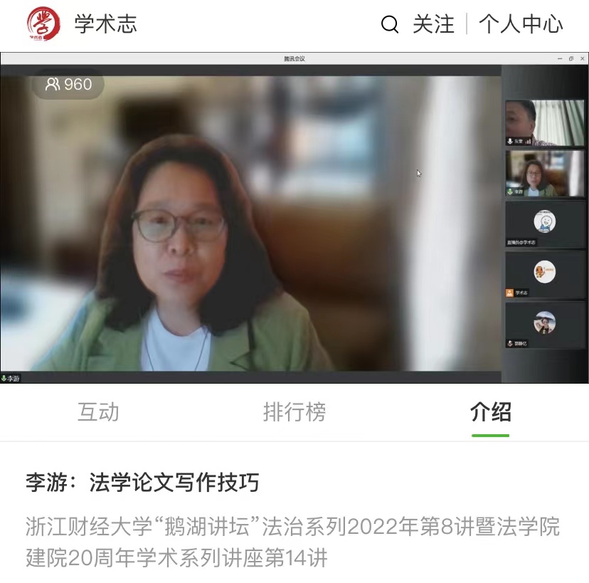 6月9日,《中国法学》杂志社总编室主任李游教授做客鹅湖讲坛,为我校师生带来一场题为“法学论文写作技巧”的学术讲座。本次讲座是色色动画 建院20周年学术系列讲座第14讲,由色色动画 田东奎教授主持,近千名观众在线聆听了本次讲座。李游教授从论文选题、写作步骤和投稿技巧三方面展开,从选题思路、大纲构建、引证规范、内容提要、研究方法等各个方面对法学论文的写作与技巧进行了全面系统的讲解。李游教授结合自身写...