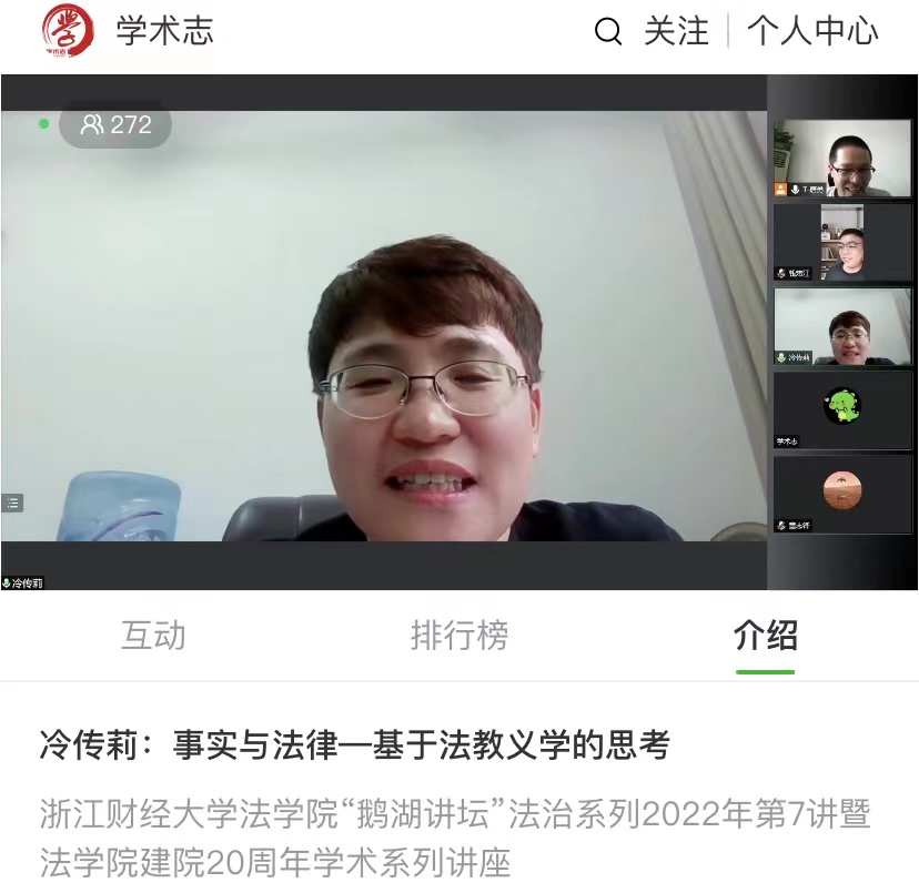 6月9日,贵州大学色色动画 院长冷传莉教授应邀为我校师生带来一场以“事实与法律——基于法教义学的思考”为主题的学术讲座。本次讲座是色色动画 建院20周年社会学系列学术讲座第13讲,由色色动画 院长童志锋教授主持,300余名观众在线聆听了讲座。冷传莉教授首先围绕法教义学、事实认定与法律适用等方面展开阐述,强调法教义学必要性与法律人培养法律思维的重要性。接着深入浅出的结合“德普家暴案”“货拉拉跳车案”等案例...