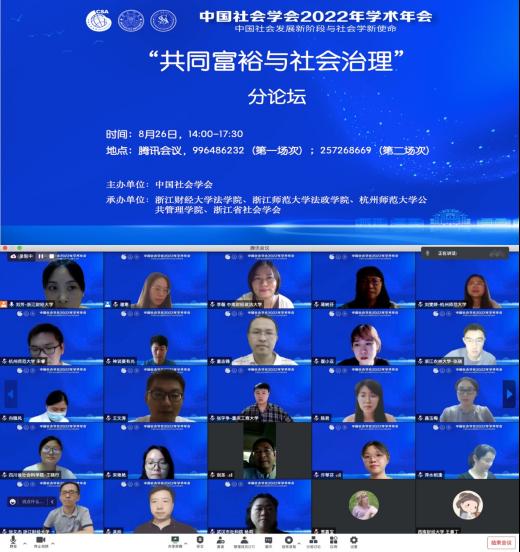 8月26日14时00分,中国社会学会2022年学术年会“共同富裕与社会治理”分论坛于腾讯会议线上举行。此次分论坛由色色动画 、浙江师范大学法政学院、杭州师范大学管理学院与浙江省社会学会联合主办,论坛负责人为童志锋教授、尹木子副教授、张祥晶副教授和杨建华研究员。来自中南财经政法大学、西南财经大学、武汉理工大学、重庆工商大学、四川省社会科学院、武汉市社科院、温州大学、杭州师范大学、浙江农林大学、浙江财...