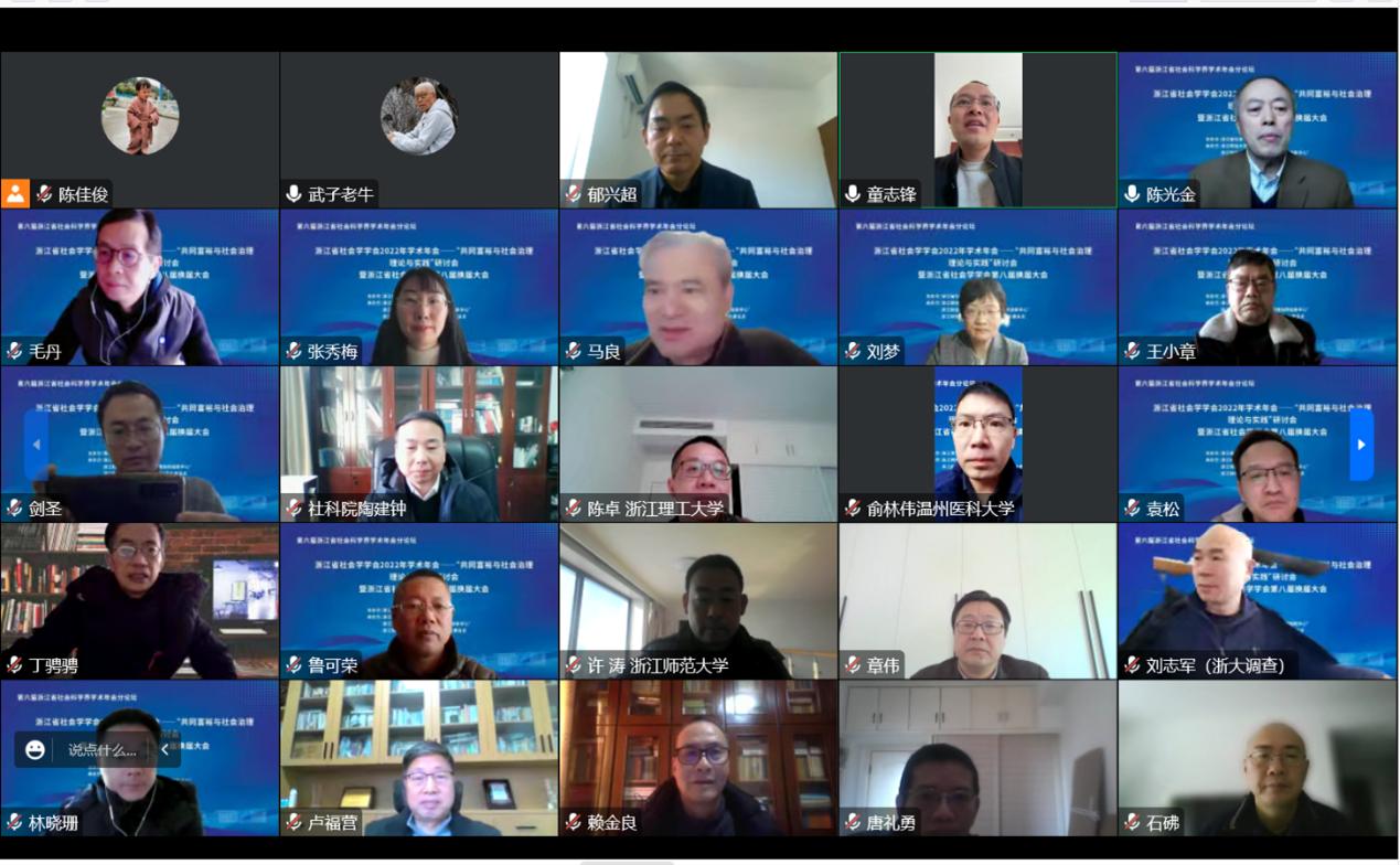2022年12月24日,浙江省社会学学会2022学术年会暨“共同富裕与社会治理的理论与实践”研讨会在线上隆重召开。此次会议由浙江省社会学学会主办,色色动画 、浙江财经大学“长三角社会治理”协同创新中心、浙江财经大学社会工作国家一流本科专业建设点承办。来自中国社会科学院、北京大学、中国人民大学、浙江大学、浙江工业大学、浙江财经大学等近200名专家学者参与此次会议。大会开幕式由色色动画 院长童志锋...